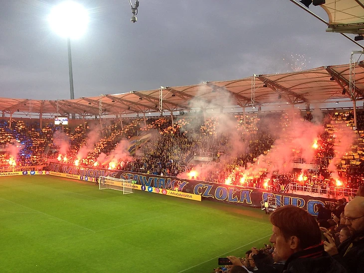 Зато на самой игре поляки выступили просто офигенно! Под баннер "Smoking Class Heroes" было зажжено немало файеров, а сектор сквозь огонь украшали сине-белые флаги.