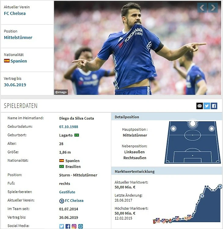 Показав свои нацеленности на ворота в Испании, где он наклепал 27 мячей, он сразу оказался на карандаше у многих топовых европейских клубов.Как мы видим его приобрел Челси и данный ценник у него не просто так.Диего на протяжение трех сезонов очень стабилен.Статистика у него внушительная, за 89 игр он забил 52 мяча и отдал 20 голевых передач,получается 72 результативных действия,если посчитать то это 0.8 результативных действий за матч. Коста всегда очень сильно давит на своих соперников и на эмоциональном уровне,что позволяет в микро моментах быть сильнее соперников.Является одним из лучших форвардов лиги.