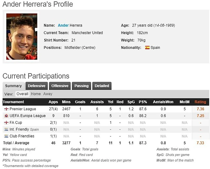 Уверен что многие не ожидали такого прогресса от Эрерры.В прошлом сезоне приятно удивил выдавая велеколепную игру и являлся ключевым игроком у Жозе.Сезоном ранее не являлся основным игроком и выходил в среднем на 57 минут.Прошлый сезон отыграл 31 матч (27 основа и 4 со скамейки), в среднем 79 минут.Действительно видно что головой думает и все делает ради команды.В этом сезоне будет так же являтся одним из лидеров Манчестера.