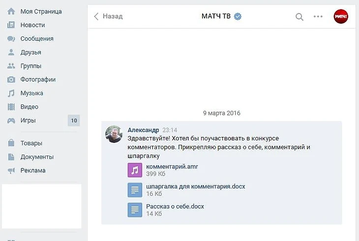 Для тех, кто не понял. Мою заявку (а по условиям нужно было рассказать о себе, записать звук и приложить шпаргалку комментатора) даже не открыли. Это видно по непрочитанному сообщению во «Вконтакте». Организаторы конкурса клялись и божились, что все заявки просмотрены и прослушаны.