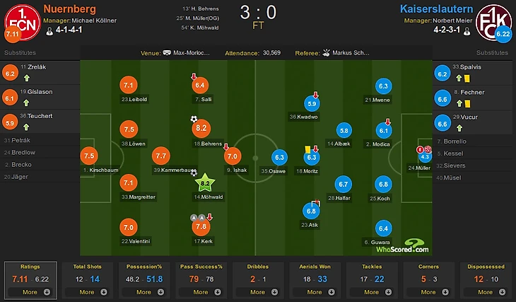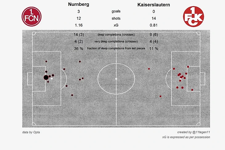 Если разбирать игру обеих команд, то Нюренберг выглядел интереснее и более изобретательным в атаке. Кайзерслаутерн смог создать что-то существенное с игры только ближе к концу игры, до этого вся угроза исходила только со стандартных положений.Нюрнберг добился победы и может смотреть оптимистично в будущее. Говорить о борьбе за выход в Бундеслигу преждевременно, но у этой команды есть "банда", а также достаточно интересные игроки. Мне лично понравился Салли - достаточно активный атакующий полузащитник из Камеруна.