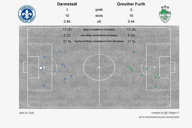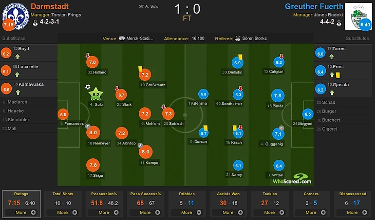 Если говорить про матч в целом, то выдался он, прямо скажем, достаточно скучным. Мало моментов, много борьбы. Дармштадт был достаточно гостеприимен и позволял совершать Фюрту подходы к своим воротам.