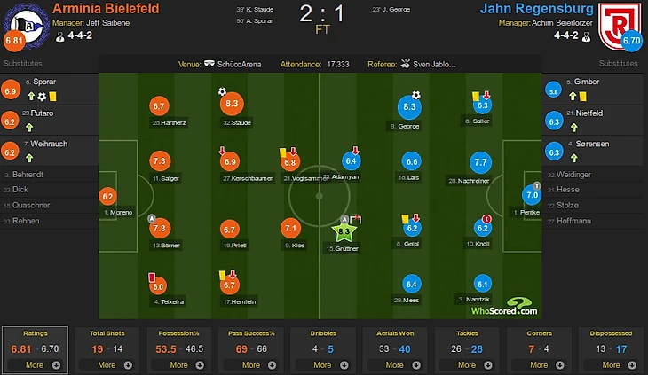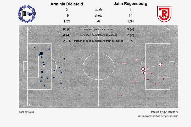 В целом, Арминия выглядела интереснее и создала достаточно моментов. Однако, и Регенсбург приятно удивил. Команда в рабочем состоянии и вполне может побороться за место в Бундеслиге 2.