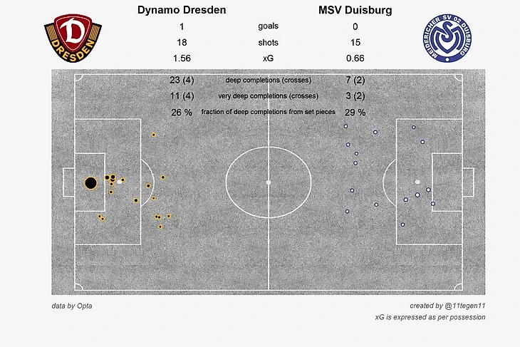 Первый тур Динамо из Дрездена начинало дома и в гости к ним приехал Дуйсбург. В межсезонье хозяева немного обновили состав - пару лидеров прошлого сезона покинули команду и на их место пришли другие игроки. Дуйсбург же после возращения у Бундеслигу 2 не делал каких-то громких трансферных приобретений.
