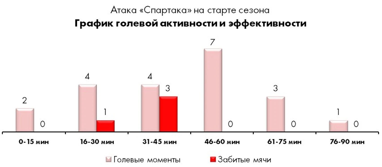 Если вынести за скобки суперкубковый овертайм с «Локо», красно-белые в 4 матчах организовали только 4 голевых момента после 60-й минуты, тогда как в прошлом сезоне созидательная активность «Спартака» на аналогичном временном промежутке составляла почти 1,7 голевых момента в среднем за матч.