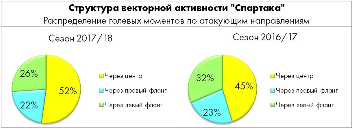 В векторном отношении атака «Спартака» по сравнению с прошлым сезоном принципиально не изменилась, хотя определённая тенденция по снижению активности на левом фланге всё-таки наблюдается.