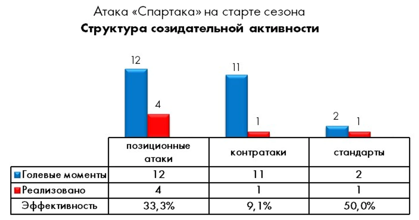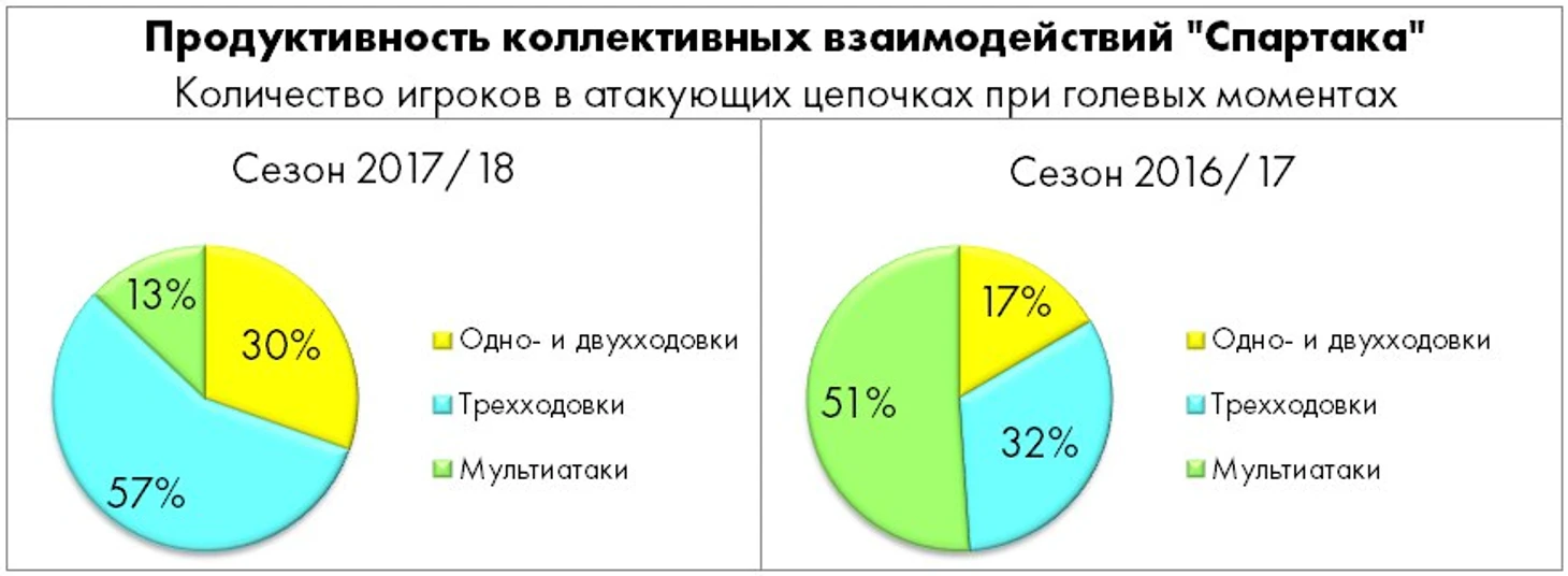 Прямым следствием того, что отвечающие за спартаковский конструктив игроки находятся на разном уровне готовности, является и резкое сокращение количества острых многоходовок по отношению к уровню прошлого сезона (с 51% до 13%).