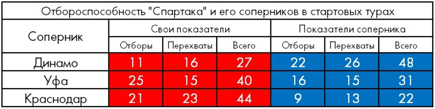 В матче с «Краснодаром» 6 из 9 своих моментов красно-белые организовали непосредственно после отборов/перехватов/подборов (скажем, атакующая цепочка, которая привела к назначению 11-метрового, началась с подбора Самедова в районе чужой штрафной), а преимущество «Спартака» по командной «отбороспособности» (общей сумме отборов и перехватов) оказалось двукратным – 44 против 22.