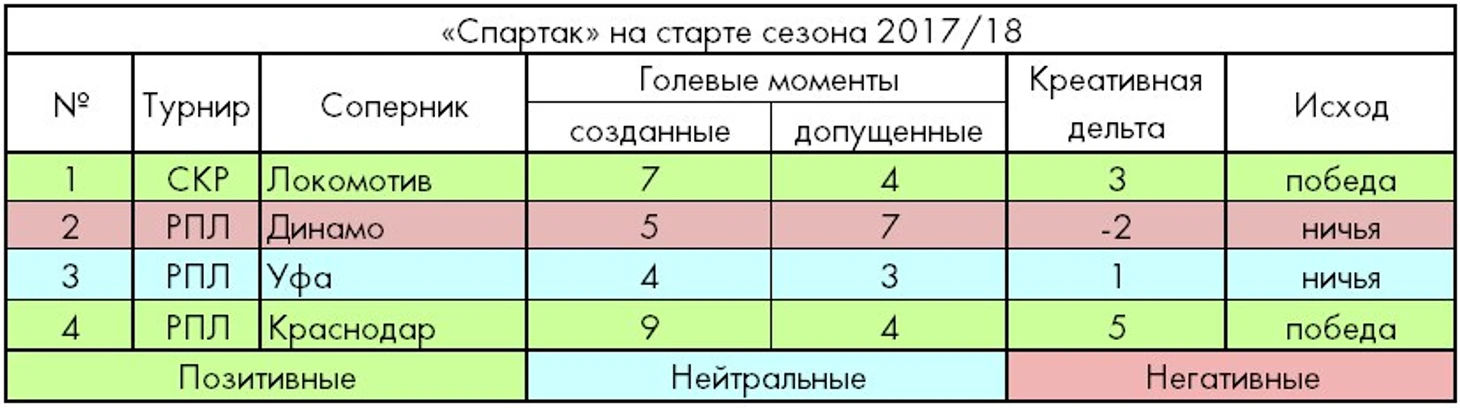 По итогам первых трех поединков спартаковцы имели околонулевой баланс созданных и допущенных голевых моментов, но в четвёртом их, что называется, прорвало. Игровой перевес «Спартака» в матче с «быками» воплотился в два безответных мяча при двукратном преимуществе по креативной дельте (9-4), хотя мячом существенно больше владел как раз «Краснодар» (40%/60%).