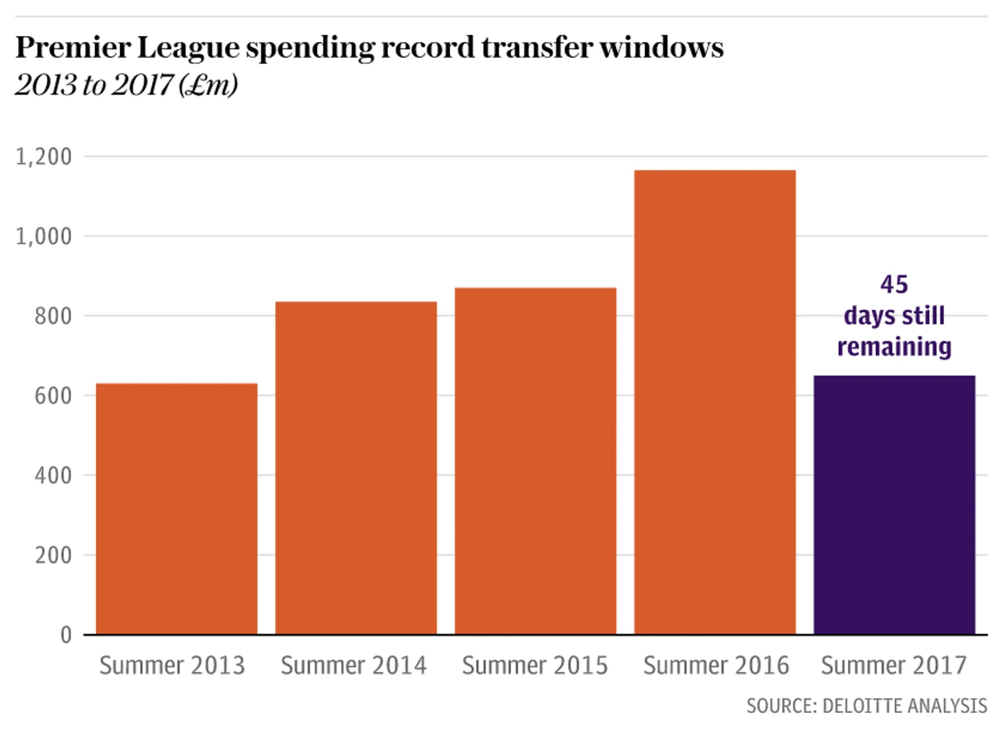 Действительно, с нами происходит что-то новое. Осталось еще 45 дней до закрытия этого трансферного окна, и, согласно цифрам, предоставленным Daily Telegraph компанией Deloitte, это уже четвертое по величине затрат трансферное окно в истории английского футбола.