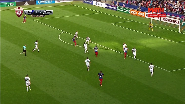 Рубин как и ожидалось, закрылся, и честно говоря, я думал, что они продержаться очень долго без пропущенных. Но опять таки благодаря индивидуальной ошибке игрока Рубина, ЦСКА смог сократить отставание.