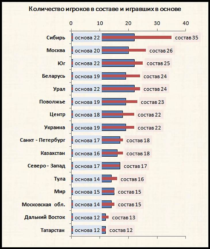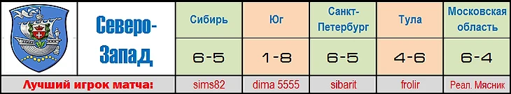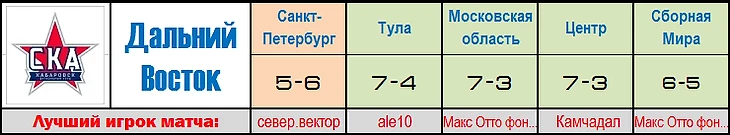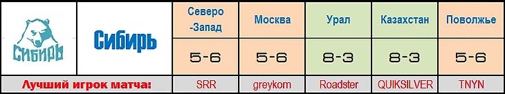 "Сибирь". Сибирские парни с воодушевлением откликнулись на идею постоять за честь родного края на Спартакиаде - большой состав исполнителей и ротация в их сборной присутствует. А вот стабильности результата им пока не достает. Возможно, что это лишь временное явление и в дальнейшем по ходу сезона конкуретная борьба им поможет в борьбе за высокие места... Отмечу еще, что сибиряки признают только 2 результата - минимальное поражение и разгромная победа 8:3 )...