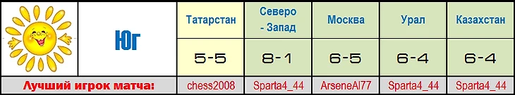 "Юг". Южане не менее ярко начали сезон. По "качеству командной игры" демонстрируемой ими на турнире они на 1 этапе были лучшими... В первой игре возможно южные парни видно только нащупывали игровые связи и потеряли 2 очка, но затем 4-х мачтевая победная серия сделала их главными преследователями лидера. А в ближайшем туре у них очная встреча - "матч тура"! Отмечу игрока Sparta4_44 - в 3-х матчах из 5 проведенных он был самым ярким игроком на поле в составе своей команде. Такое на старте в других сборных не удавалось никому...