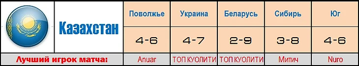 "Казахстан". Сборная этого региона (а она мне небезразлична, т.к. полтора года служил там в рядах СА) начала сезон с баранкой в графе "очки" после 1-го этапа... но сказать, что команда неконкурентноспособна, конечно же нельзя... плюс еще страшное невезение преследует команду... в последнем туре казахская сборная набрала больше всех ф-очков в туре, на поле феерил Nuro, показав рекордный результат в очках за тур на этом этапе, - а команда проиграла все равно свой матч... тем не менее последняя игра показала высокий потенциал этой сборной... и в таблицу очки придут в итоге, уверен...
