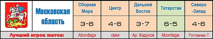 "Московская область". Подмосковная команда не очень удачно начала сезон... Состав укреплялся уже по ходу... Надеюсь, что их лучшие матчи еще впереди, т.к. есть качественные исполнители в составе и вся команда подтянется в мастерстве к своим лидерам... а пока у команды лишь одна победа на 1 этапе Спартакиады... но вся борьба унас ещё только начинается...