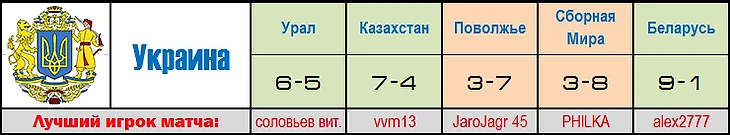 "Беларусь". Для меня лично результаты этой сборной - главная неожиданность старта. Команда, переполненная сильными исполнителями, явно на старта не выжимала максимума из своих возможностей... А после эйфории от победы со счетом 9:2 получила просто две оглушительных оплеухи... что это Было? разброд и шатание в коллективе? не возможность держать удар? или просто временный сбой командного механизма этой сборной? Узнаем в следующих турах...