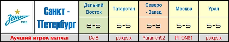 "Санкт-Петербург и область". Самая миролюбивая команда Спартакиады! 3 ничьих в стартовых 5 турах, а в оставшихся двух все было то же близко к фифти-фифти:)... Цифра 5 в итоговом счете на табло красовалась в 8 из 10 случаев. Сколько забил лучший питерский бомбардир? Правильно - 5! Сборная этого региона прошла 1 этап под девизом "В Питере Пять!" (с)...