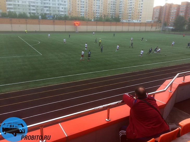 Стадион “Орион” не особо выдающееся строение с одной трибуной вместимостью 3000 человек, которая по постройке напоминает Запад на Стрельцова. Поднимаясь наверх вся поляна становится как на ладони. Второй трибуны нет, но за нее вполне могут сойти многоэтажки с которых однозначно открывается роскошный вид. К сожалению, обнаружить поклонников местной футбольной команды на балконах и в окнах было не суждено, и весь футбольный бомонд (около 200 человек) Железнодорожного расположился на трибуне. Кстати, хочется отметить, что хоть на футболках “Олимпа-СКОПА” написано “Балашиха”, в команде четко привязывают себя к округу Железнодорожный. Вот такая вот локал тим.
