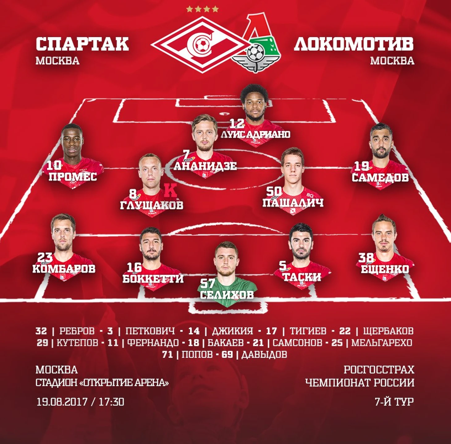 «Спартак»: Селихов, Ещенко, Таски, Боккетти, Комбаров, Пашалич, Глушаков (к), Самедов, Промес, Ананидзе, Луис Адриано.