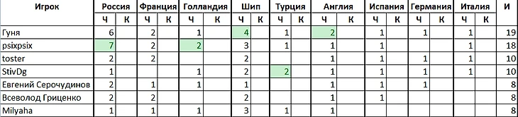 Евгений Серочудинов, Всеволод Гриценко и Андрей Milyaha забили по 8 голов. Андрей умудрился сделать это, начиная почти все чемпы на лавке. А Евгений часто отправляется туда после первого тура. Респект первому и фи второму.