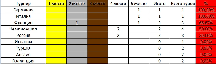 Как видим, показать лучший результат по ФО в туре у нас пока не получается ни в одном чемпионате (в прошлом году нам удалось это сделать 19 раз), да и в топ-3 заходили лишь однажды (70 раз - в прошлом году). Но, все еще впереди!