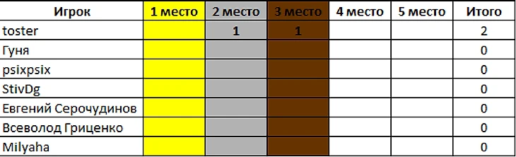 В данном разделе у нас пока только один герой - это Серега toster, который попал в топ-5 игроков тура уже дважды.
