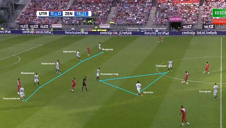 Во втором тайме более активно для передачи стали предлагать себя и Паредес с Ерохиным, опускаясь в опорную зону. Расстановка Зенита во втором тайме при переходе в атаку: