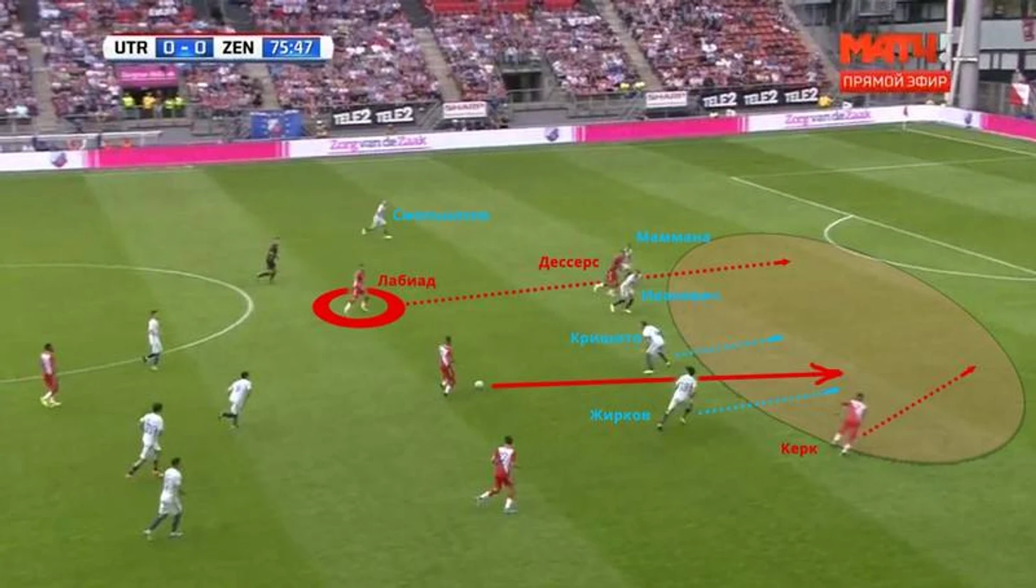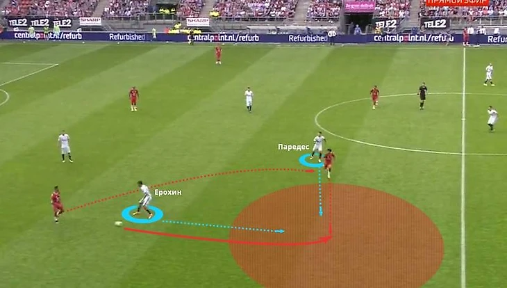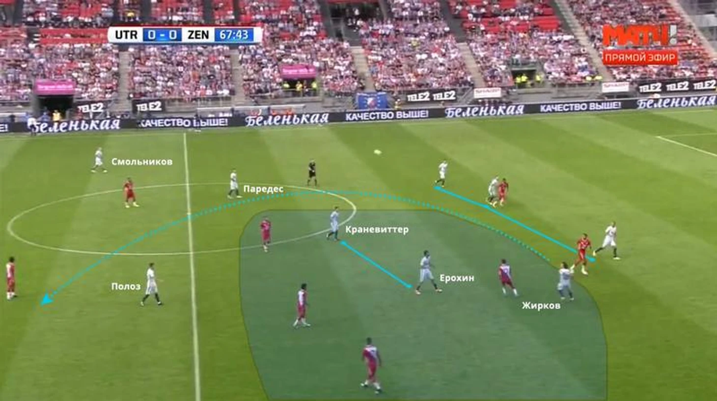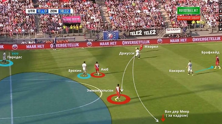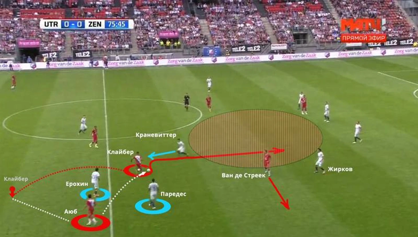 Начнём с ввода мяча. Обозначение прессинга и попытка помешать короткому розыгрышу удара от ворот. Клайбер в очередной раз начинает атаку с фланга от своей штрафной. Кокорин и Полоз не позволили отдать короткий пас центрдефам, но они не ожидали, что Клайбер опустится для короткого розыгрыша. Его выдвигается прессинговать Ерохин и в эту зону тут же ускоряется Аюб. Паредес явно слишком пассивно ведёт себя. Стоит отметить, что игроки Утрехта редко предоставляли свободу оппонентам в такой ситуации. Аюб получает мяч, пару разворотов и тут же отдаёт мяч в свободную зону, куда врывается уже Клайбер. Ерохин просто бросил своего игрока и занялся Аюбом, вместо того, чтобы продолжить играть против Клайбера.