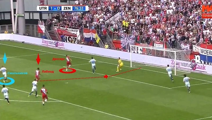На 28ой минуте случился самый опасный момент за весь матч. И в нём не доработал до конца Смольников. По ходу развития атаки было видно, что Смольников в более выгодной позиции и контролирует Дессерса по диагонали со спины. Но Дессерс смог легко пробить в упор, да ещё и добить. Почему? Смольников все это время смотрел на мяч и бежал в штрафную, хотя необходимости в этом не было, а не сопровождал нападающего Утрехта. Передачу на вбежавшего Керка контролировали Кришито и Маммана, а больше в той зоне никого не было. В итоге Иванович в последний момент понимает, что пас идёт на набегающего бельгийца, в тот же момент опомнился и Смольников. Это стало второй ошибкой, оба не помешали Дессерсу пробить, но и пойманные на противоходе, оба защитника не смогли помешать добить нападающему. Чудо и Лунёв на стороне Зенита. При повторе момента видно, что Дессерс и не совершал каких-то обманных манёвров, чтобы выйти на ударную позицию.