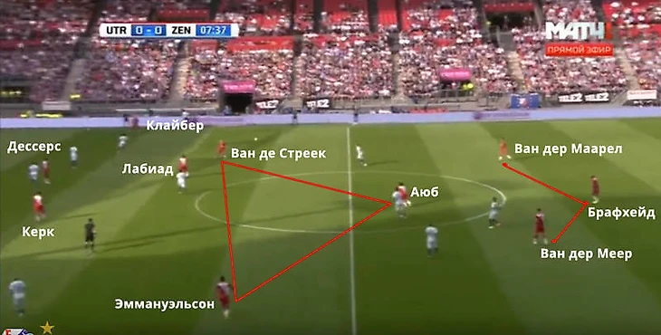 Утрехт при переходе в атаку перестраивался на игру в 3 защитника: Ван дер Маарел – Брафхейд – Ван дер Меер.