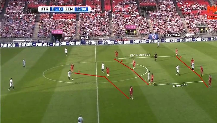 Часто случались провалы из-за неудачных попыток высокого прессинга. Кокорин и Дриусси уходили прессинговать защитников Утрехта. Что открывало зону действия для Аюб или Эмануэльсона. Если Ерохин уходил выше в прессинг, то его одного там не хватало, при этом часто ловили Паредеса в полупозиции, когда аргентинец не помогает прессингу, но и не помогает Краневиттеру. После перерыва ситуация изменилась, когда Манчини реши опустить Паредеса ниже в одну линию с другим аргентинцем в опорной зоне. Дриусси и Кокорин так же не проявляли агрессивного давления, в итоге ничего, кроме свободных зон не получалось. Например Ерохин, Дриусси и Кокорин уходили 3 в 3 на прессинг, Краневитер и Паредес оставались 1 в 1 со своими игроками, а за их спиной в свободной зоне разворачивалась атака 5 в 5. Зенит проигрывал отдельные зоны из-за невысокой плотности при обороне и этим умело пользовались игроки Утрехта используя то длинные, то короткие передачи. Чувствовалась несогласованность действий у средней линии питерского клуба.