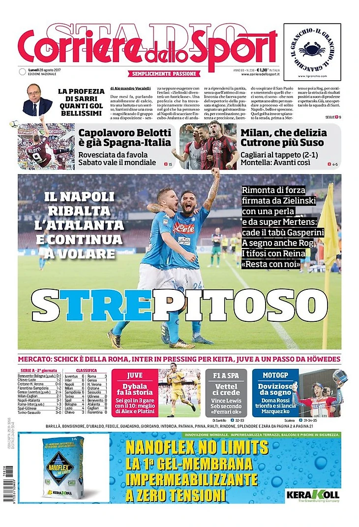 «Наполи» переигрывает «Аталанту» и продолжает летать. Сильный камбэк с помощью Зелиньского с его голом-жемчужиной и супер Мертенса: пало проклятие Гасперини. Забил также Рог. Тифози обратились к Рейне: «Оставайся с нами».