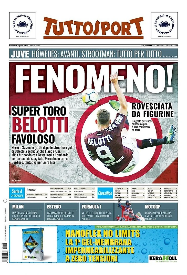 Супер «Торино», невероятный Белотти. Разбит «Сассуоло» (3:0): после громкого гола Белотти забили также Льяйич и Оби. Миха разъярён с Кастелацци и Ломбардо из-за ошибки в замене. Рынок: приходит Бурдиссо, попытка заполучить Эмре Мора.