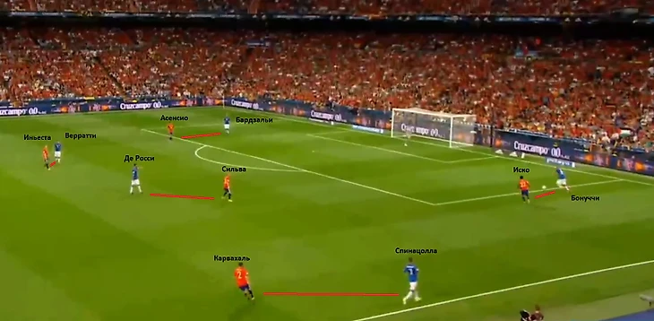 После неточного удара Рамоса со штрафного Буффон ввёл мяч в игру пасом на Бонуччи. Иско прессингует Леонардо у штрафной Буффона. Лео принимает решение выбить мяч вперёд. Как видно на фото, каждого игрока итальянской команды на своей половине поля опекает игрок испанской сборной. В конце эпизода мяч, вынесенный Бонуччи, перехватывает Карвахаль.