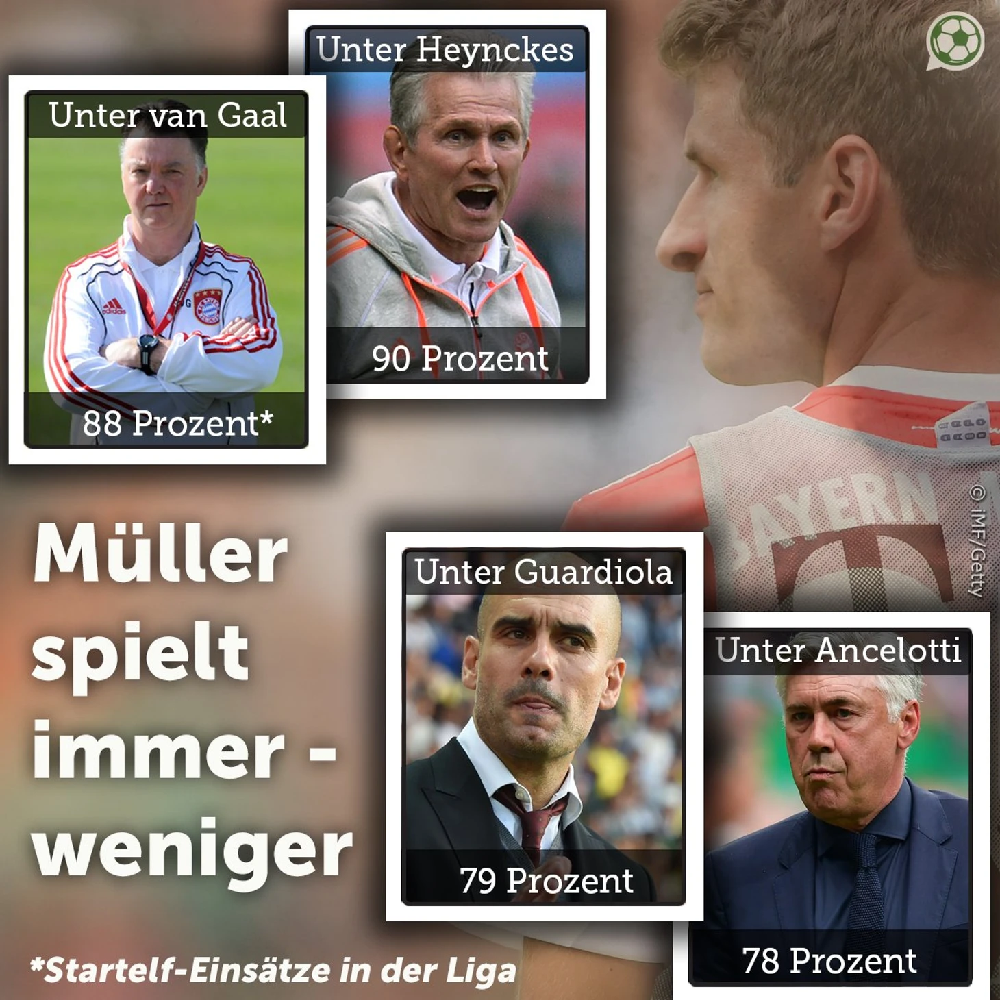 Есть занимательная статистика, по которой видно, что при каждом новом тренере в процентном соотношении Томас играл все меньше. Луи ван Гаал и Юпп Хайнкес без Мюллера не могли, он идеально подходил под их атакующее видение. Его умное движение без мяча, шикарное использование свободных зон, поддержка прессинга, умение обработать мяч в штрафной с высокоподнятой головой. При Гвардиоле Мюллер задействован был гораздо реже, но это все «издержки» любви каталонца к ротации. Пепу Томас тоже оказался важен. Он не только пытался встроить игроков в своих схемы, но и часто подбирал схемы под конкретный набор игроков. Пеп знал, как Мюллер будет наиболее эффективен, и сам игрок за три года стал более функциональным.
