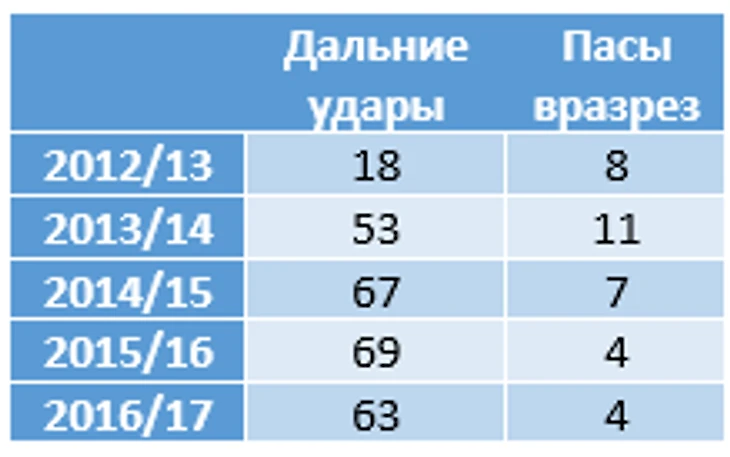 Ранний Коутиньо был лучшим за все время в «Ливерпуле». За 13 матчей сезона-2012/13 он сделал 8 передач вразрез (именно моменты после таких пасов считаются самыми качественными). В последний сезон сделал всего 4 таких паса. Связь между сокращением количества по-настоящему острых пасов и увеличением кол-ва дальних ударов очевидна (логично, так как они выполняются из похожих зон).