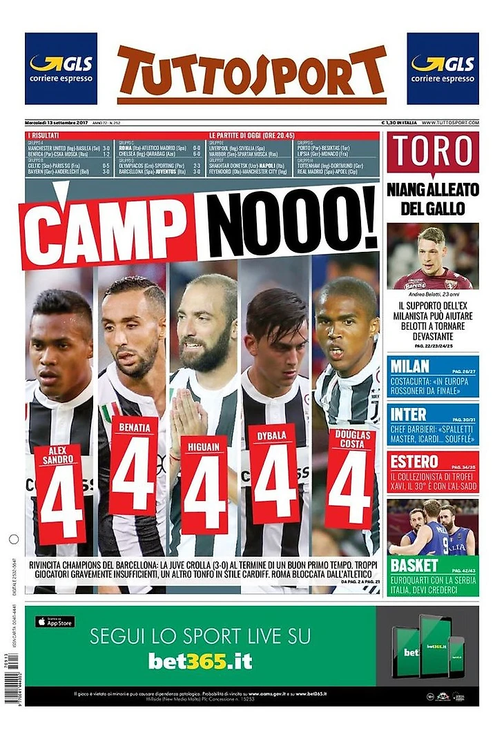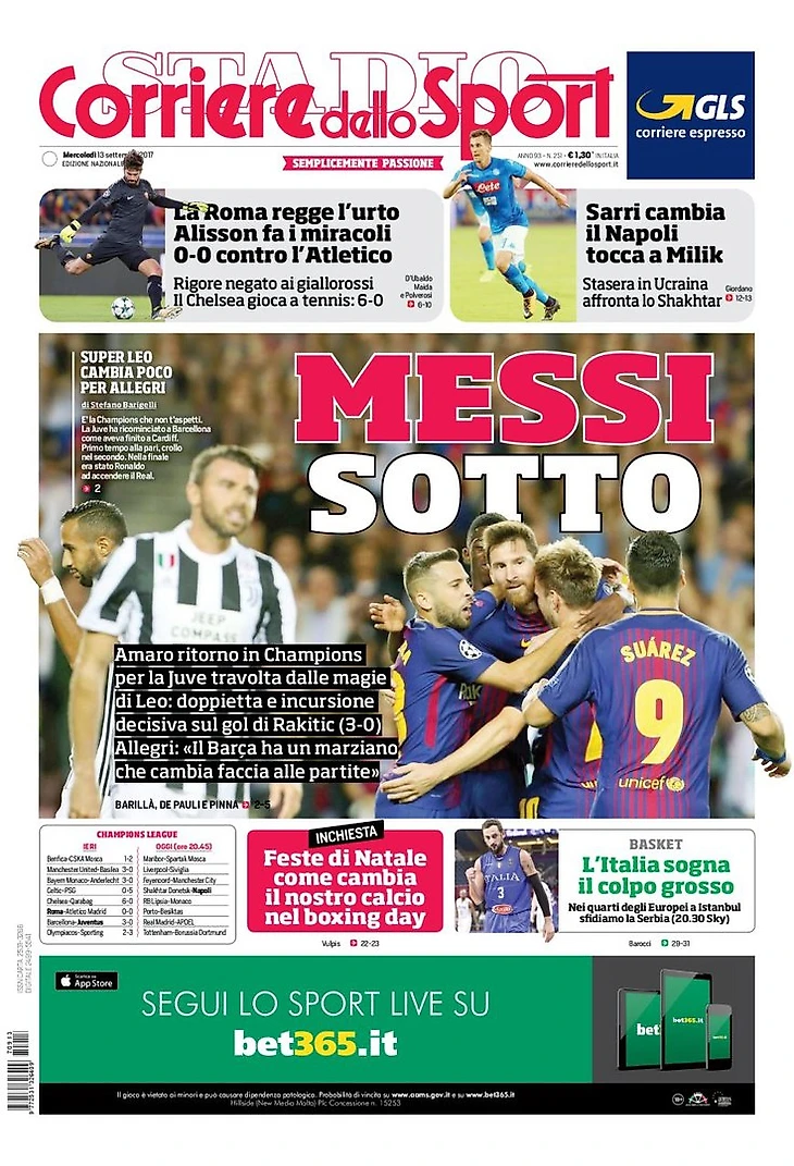 Горькая Лига Чемпионов, «Юве» проиграл 3:0. Лео – марсианин: с 2 жемчужинами, штангой и отличными трюками он тащил «Барсу» на «Камп Ноу». Аллегри не ищет оправданий («Мы играли верно только тайм») и пришпоривает Игуаина: «Более спокойный».
