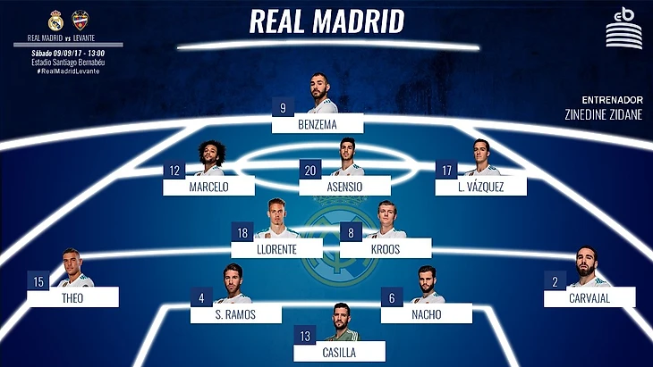 В запасе остались: Люка Зидан, Вальехо, Бэйл, Каземиро, Иско, Ковачич, Себальос.