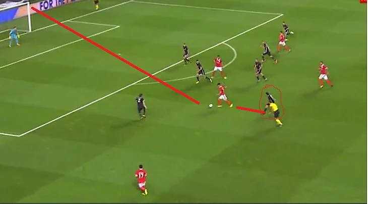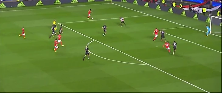 У ЦСКА самым опасным момент был удар Головина рядом со штангой на 30 минуте. Причем началось все с очень интересного момента, который не раз будет повторяться в течении матча: Акинфеев сильно выбивает мяч от ворот на правый фланг, где занимает позицию Марио Фернандес, которого не атакует защитник Бенфики, что дает возможность выиграть верховую борьбу и начать атаку.