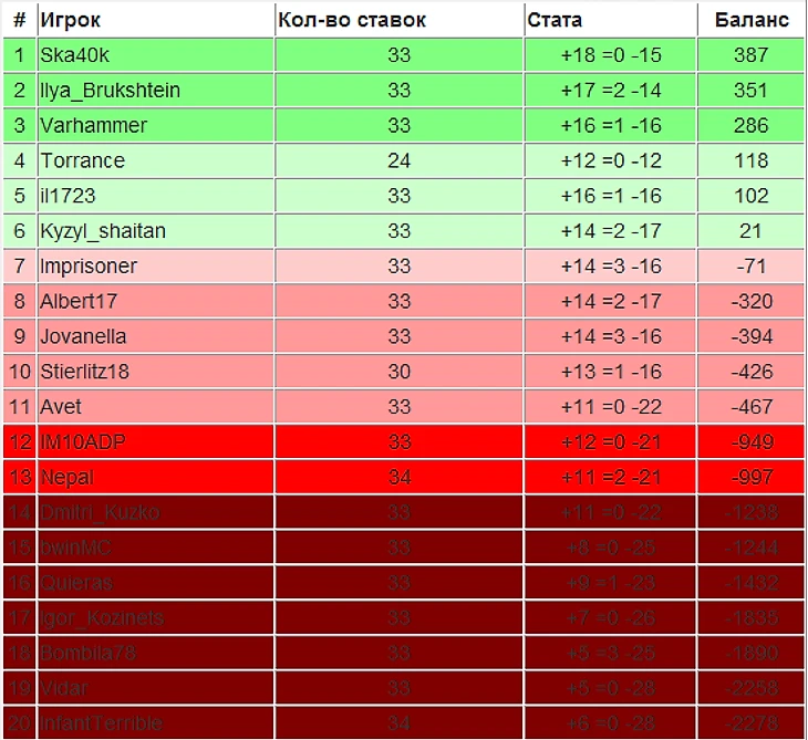 А также предлагаю вам таблицу, если б наш турнир проходил по стандартной каперской схеме, где баланс определяет место в таблице, прошу принять ее просто к сведению, никакого практического значения она не имеет: