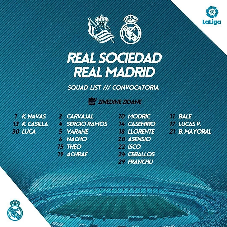 Отвечая на вопросы журналистов перед выездным матчем против «Реал Сосьедад» на «Аноэте», главный тренер «Мадрида» Зинедин Зидан заверил, что знает, как сыграет его команда, несмотря на потерю Тони Крооса и Вальехо, а также выступил в защиту Гарета Бэйла, попросив дать ему время, чтобы набрать форму.