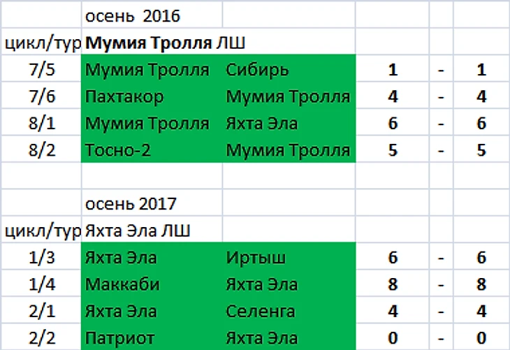 Отмечу, что в 13-м цикле ЛШ 2013/14 Яхта Эла 3 (!) матча подряд завершила со счетом 4-4 (туры №2-4), более того - она сыграла вничью 4-4 и в 6-м туре (в гостях с Подольчанкой).