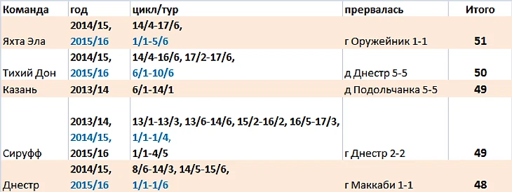 В ЛШ рекордная беспроигрышная серия -...у того же Оружейника 15 игр (ЛШ 2013/14). В 16/3 он уступил дома Яхте Эла 7-11.