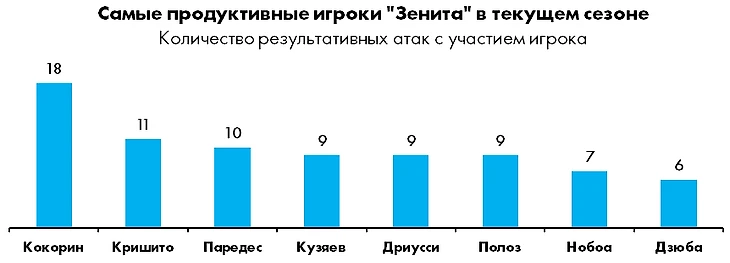 В топе по результативным атакам уверенно держится и отдавший очередную предголевую передачу Кузяев (уже третью со старта сезона, больше только у Парадеса - 4), а также отличившийся во втором матче подряд Дмитрий Полоз. Постепенно взбирается вверх и прогрессирующий Дзюба, в двух предыдущих сезонах уверенно «разменивавший тридцатку» этого рейтинга.