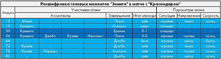 Шишкин не справлялся со скоростью Полоза, Газинский и Каборе терялись под прессингом (по 1 ключевой потере у каждого), а командное преимущество «Зенита» в росте (при навесных стандартах в штрафной Крицюка находилось сразу 6 полноценных боевых единиц – высокорослые Мевля, Маммана, Ерохин и Дзюба, плюс прыгучие Кокорин и Иванович) приводило к неразберихе и хаосу в стане хозяев (2 момента, 1 гол).