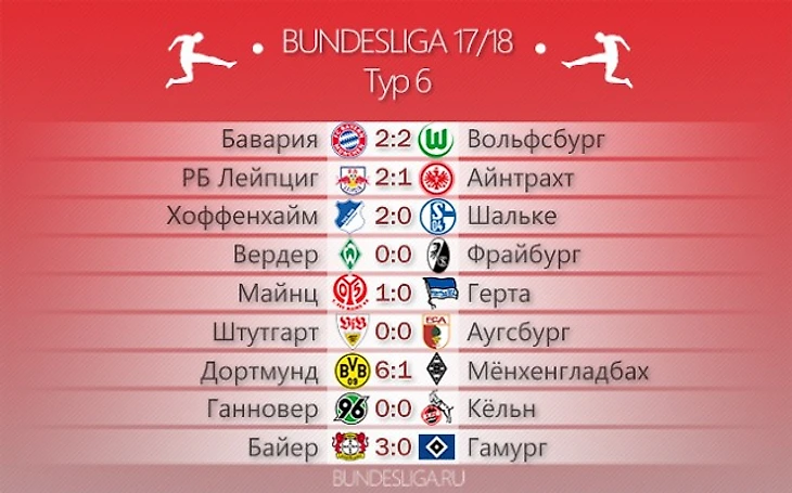Неожиданная потеря очков «Баварией», очередные победы «Хоффенхайма» и Лейпцига, новые разгромы авторства Дортмунда с Леверкузеном и все другие события шестого тура Бундеслиги – в нашем традиционном обзоре!