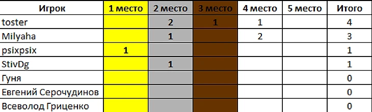 Тут не так все грустно: Вова стал лучшим в 6-м туре в Германии, Серега toster - вторым в том же по счету туре в Испании, Андрюха - вторым в Голландии.