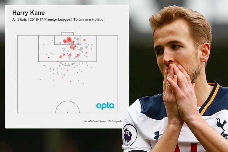 Еще есть другой тип форвардов. Они обычно играя в паре, помогают забивать голы друг другу. Пример: Синдзи Окадзаки из "Лестера", этот игрок всегда остается в тени Варди, но приносит пользу команде не меньше. Его задание на поле - отвлекать защитников соперника и уводить их за собою с помощью рывков, тем самым ломая оборонительные построения, в которые врывается Марез или Варди, которые без труда разбираются с вратарем. Им слава за забитый гол, а Синдзи, который не касаясь мяча поучаствовал в голевой атаке, остается не замеченным для болельщиков. Так вот, все эти качества, что я перечислил, используя для примеров разных игроков, воплощены в Кейне. Это очень умный футболист со своим стилем, когда у него в ногах мяч я его не спутаю ни с кем, ведь таких игроков не так много, как нам кажется. Помните я говорил о том, что хорошего форварда отличает способность бить только с выгодных позиций (xG), и у Кейна в целом все в порядке.