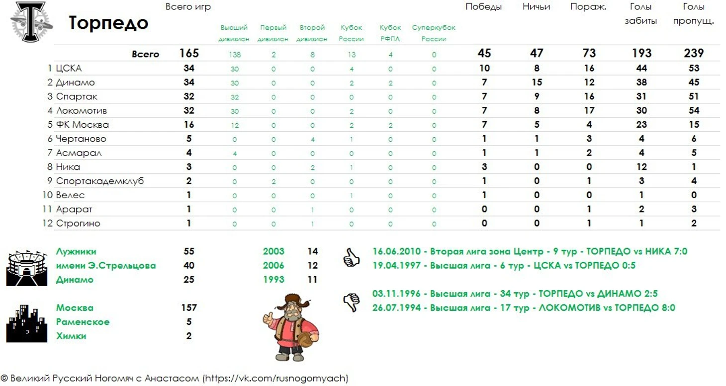 В последнее время я молчал несколько дней, хотя обещал давать материал.Знаю, исправляюсь.Сегодня мы поговорим о дерби.О московских дерби.Я собрал информацию по этим играм и буду выдавать порционно, как всегда.От общего к частному:Всего на данный момент я насчитал 1100 московских дерби во всех ПРОФЕССИОНАЛЬНЫХ лигах, кубках и прочих соревнованиях.Больше всего матчей приходится на высший дивизион - 537, а также на второй - 467.В кубке России были столкновения от 1/256 финала до финала и их было 79.Самое большое количество дерби пришлось на 1992 год - 140, следующий по количеству год - 2000 - 68 штук. Хуже всего по этому показателю было в 2011 - всего 14 во всех соревнованиях.Самые популярные стадионы - #Лужники - 152 матча и #Динамо - 136.Самый популярный счет 1:0 - 181 раз был зафиксирован.Самый крупный - 11:1 - в 1993 году Динамо-2 обыграло Локомотив-Д