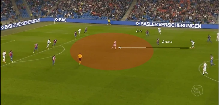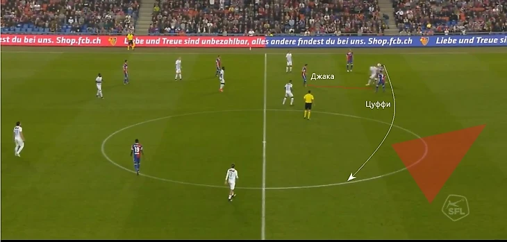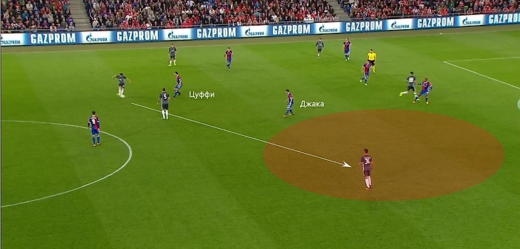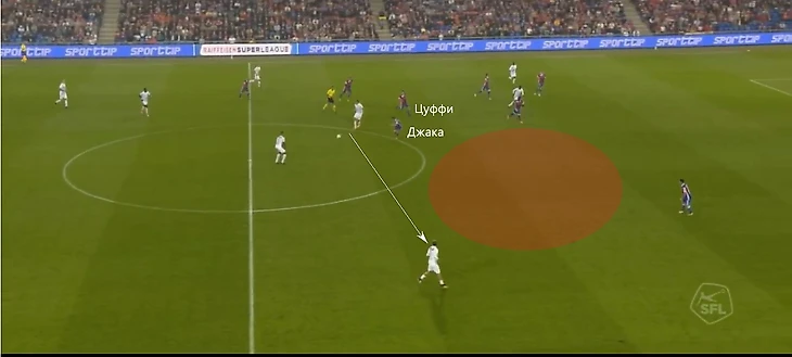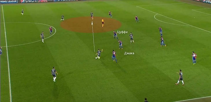 На этом фото расстояние между Цуффи и Джакой метра 3-4, они оба в ступают в отбор на правом фланге. В центре большая свободная зона, которой соперник должен воспользоваться.